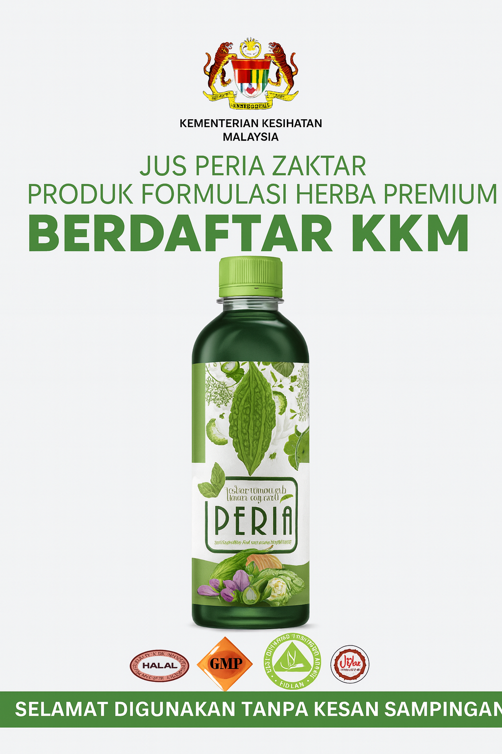 Jus Peria Zaktar diformulasikan di fasiliti bertaraf GMP dan sedang melalui proses pendaftaran KKM. Setiap batch diuji di makmal bebas dan disahkan bebas daripada logam berat, steroid, dadah serta bahan kimia berbahaya yang boleh memudaratkan kesihatan.
